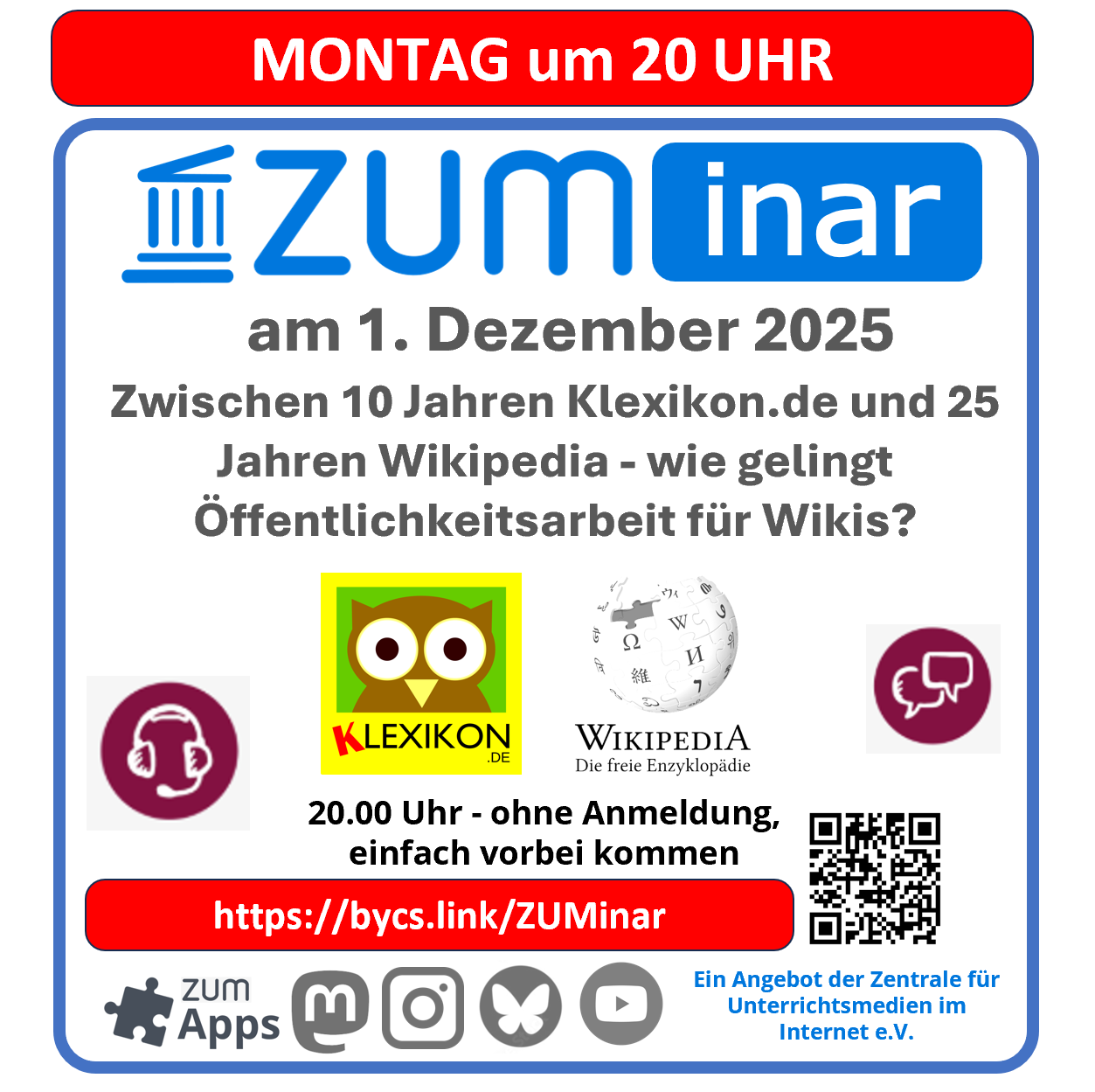 Liebes #FediLZ, in der #Grundschule kennen es alle: das #Klexikon! Wie geht es mit ihm weiter? Co-Gründer Michael Schulte stellt die Frage: Zwischen 10 Jahren Klexikon.de und 25 Jahren Wikipedia – wie gelingt Öffentlichkeitsarbeit für Wikis? Kommt vorbei: https://bycs.link/ZUMinar um 20 Uhr